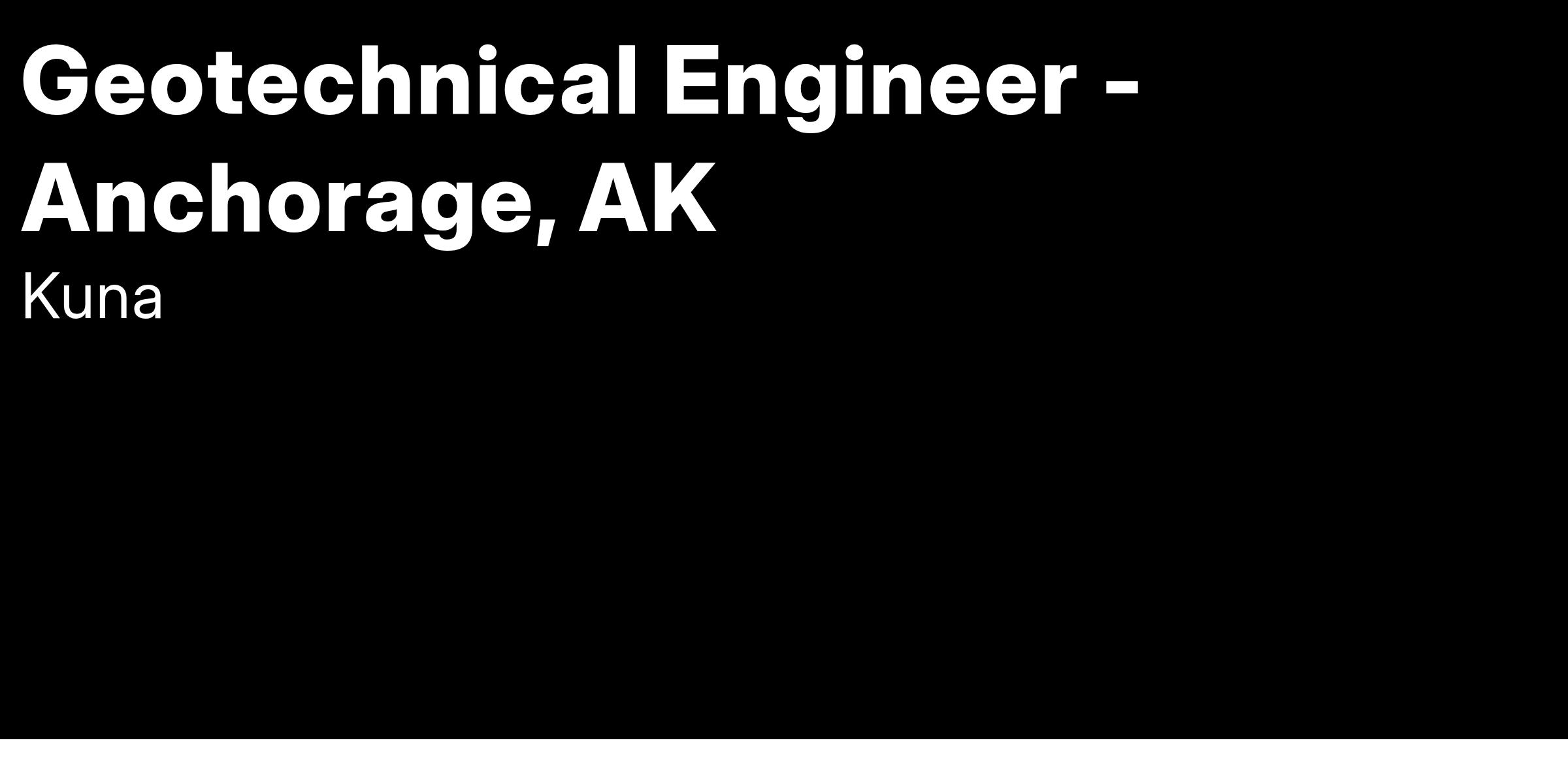 The Geotechnical Engineer will support the Kuna Engineering and its clients throughout Alaska, including projects at Red Dog Mine and rural infrastructure projects. The individual will provide support for geotechnical design activities for infrastructure projects to include buildings, utilities, and roads. The individual will also lead necessary geotechnical evaluations and field investigations. Stability analyses, seismic analyses, and other support for various building or other infrastructure projects will be a key element of the individual’s responsibilities. The individual may also support various environmental projects as time permits, including site investigations and permit application development. The Geotechnical Engineer shall work with the Environmental Director to plan schedules and other activities related to projects as assigned.