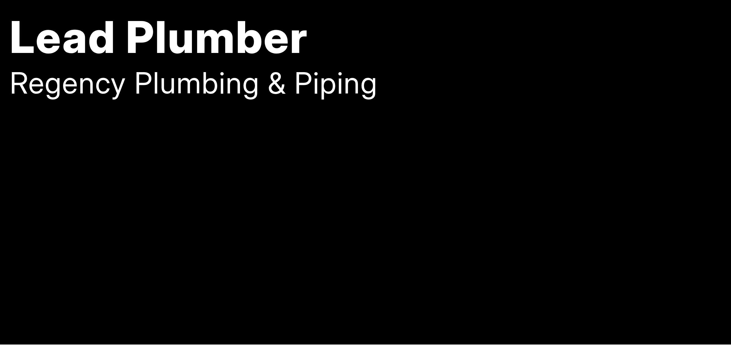 Regency Plumbing & Piping, Inc. is currently hiring for a full-time Lead Plumber to lead a plumbing team installing water, waste, vent, and compressed air systems in the Orange, CA area. This plumbing position typically works 5:30 AM to 2:00 PM. We pay our Lead Plumbers a competitive wage of $30.00 - $50.00+/hour.